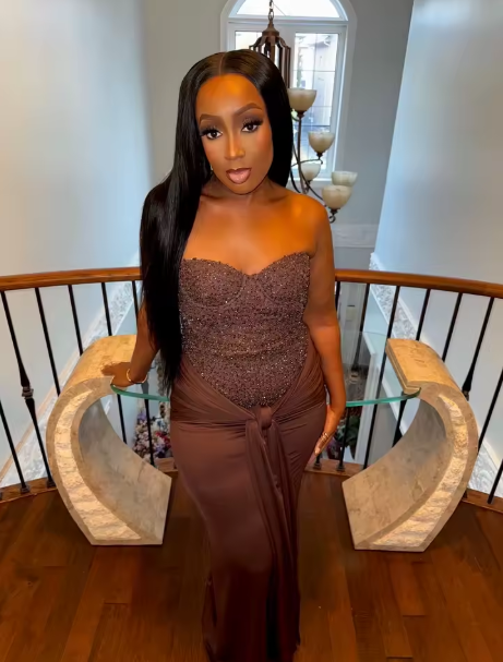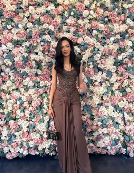 Crafted in a rich bronzed-sienna tone with a shimmer-embellished bodice, this gown features a sleek, sculpted fit that transitions into a soft satin drape. Strapless, structured, and designed to accentuate curves it’s the dress that owns the evening the moment you walk in.